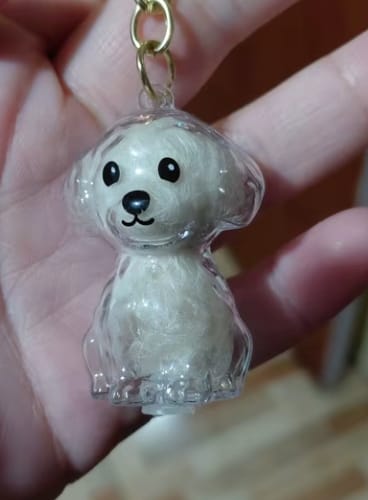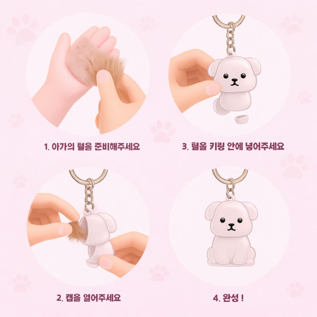 방법은 간단합니다 ! 열쇠고리에 작은 구멍이 있어요 뚜껑을 열고 털을 안에 살며시 넣은 다음 다시 닫으면 됩니다 !